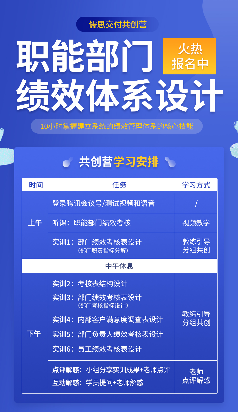 A:共创营采用”721”学习方式(10%理论学习、70%项目实践、20%复盘解惑),也是输入、实践、复盘的闭环式学习,输入,是通过知识学习形成理论基础;实践,是通过项目实践学会逻辑、方法、工具的应用;复盘,是通过分享点评、答疑解惑,打通逻辑形成闭环。